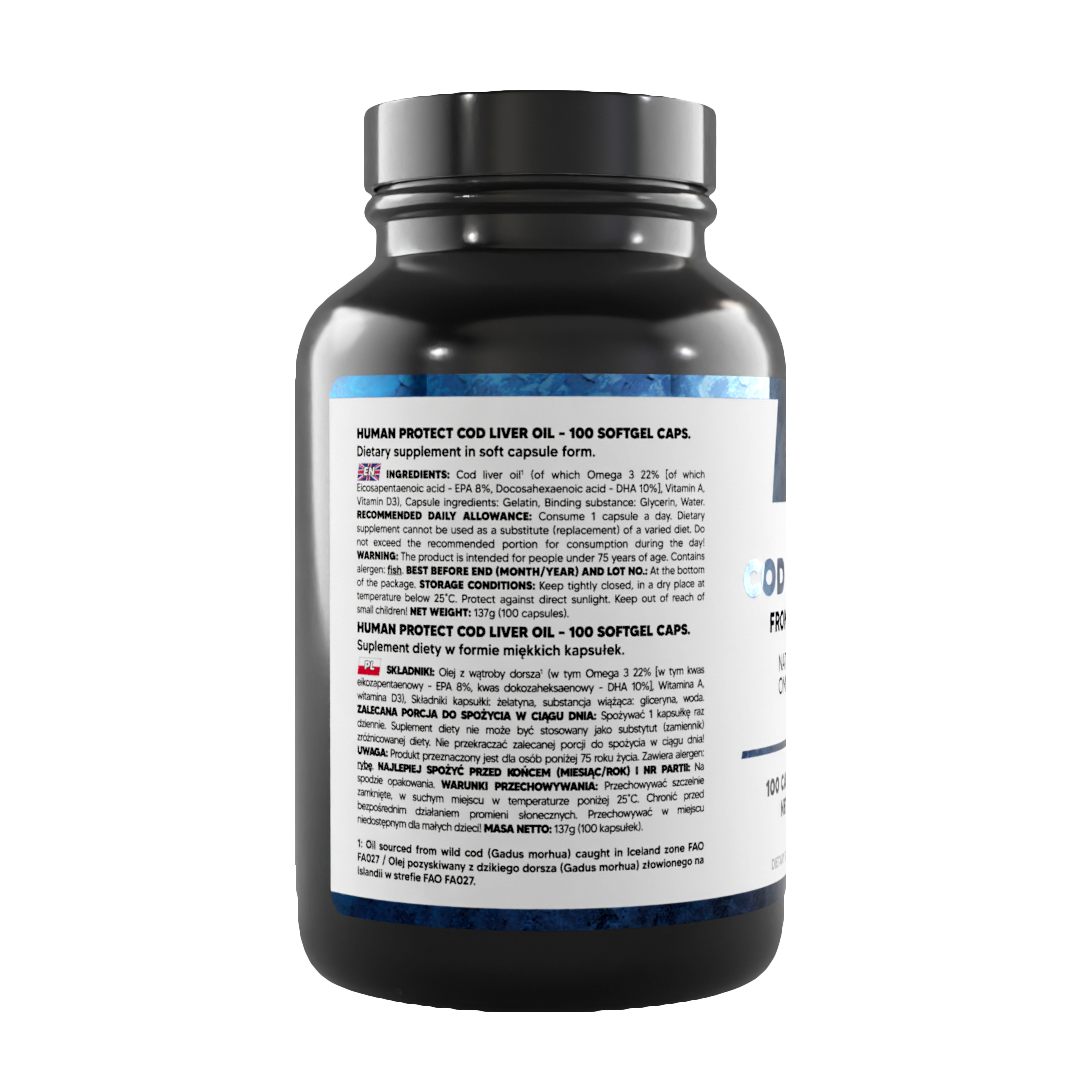 W odróżnieniu od wielu tanich zamienników, Human Protect kładzie nacisk na standardy oczyszczania. Olej pozyskiwany jest z dorszy żyjących w czystych Islandzkich akwenach (strefa FAO FA027), co eliminuje ryzyko zanieczyszczenia metalami ciężkimi. ⚓ Dodatkowo precyzyjny dobór proporcji witamin A i D sprawia, że suplement jest bezpieczny i efektywny, eliminując potrzebę kupowania kilku osobnych preparatów.
