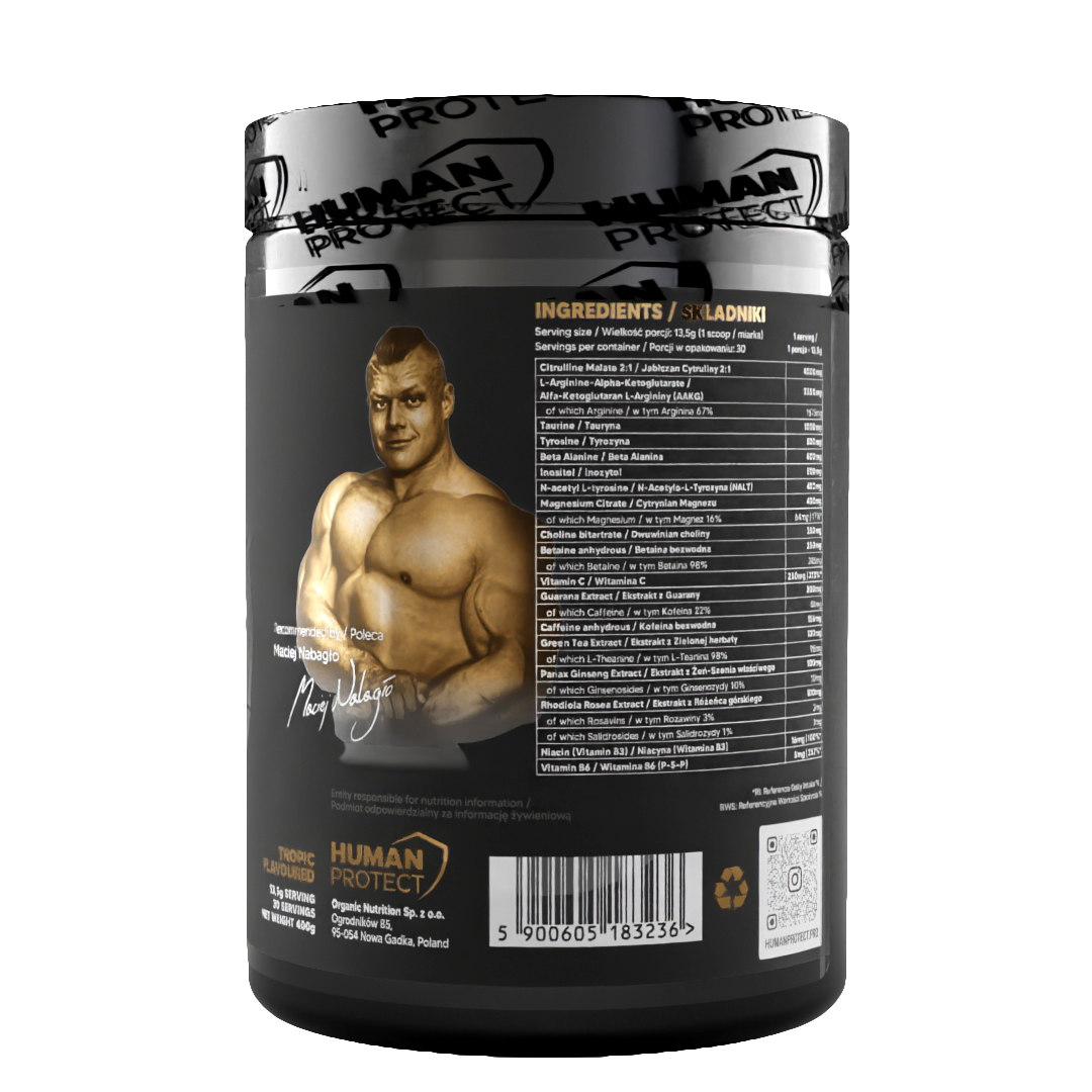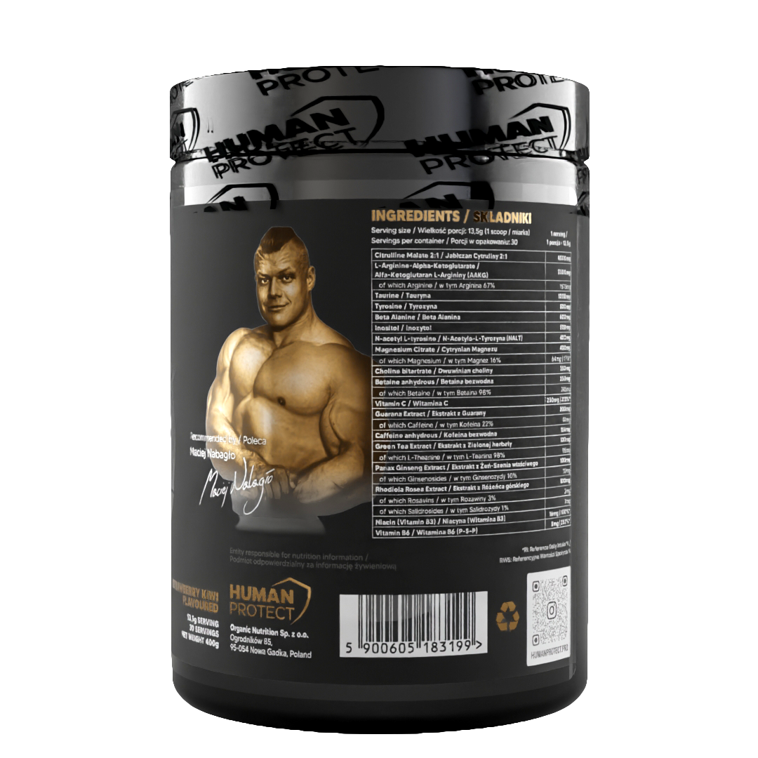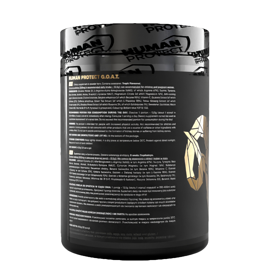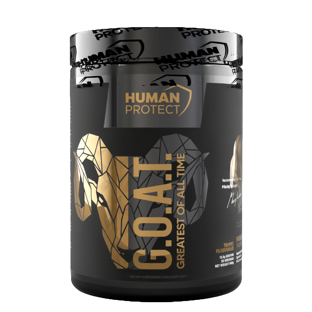 Human Protect G.O.A.T. to nowoczesny booster przedtreningowy opracowany we współpracy z kulturystą IFBB PRO, Maciejem Nabagło, stworzony z myślą o tych, którzy nie idą na kompromisy. To połączenie surowej mocy, precyzyjnych formuł i doświadczenia sportowego, wszystko w jednym opakowaniu.